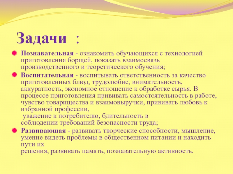 Воспитательная - воспитывать ответственность за качество приготовленных блюд, трудолюбие, внимательность, аккуратность, экономное отношение к обработке сырья. В процессе приготовления прививать самостоятельность в работе, чувство товарищества и взаимовыручки, прививать любовь к избранной профессии,