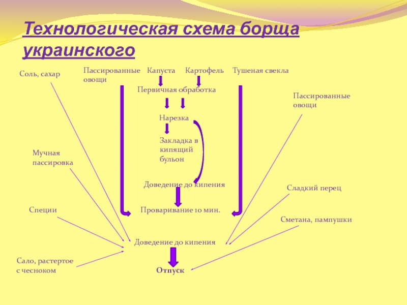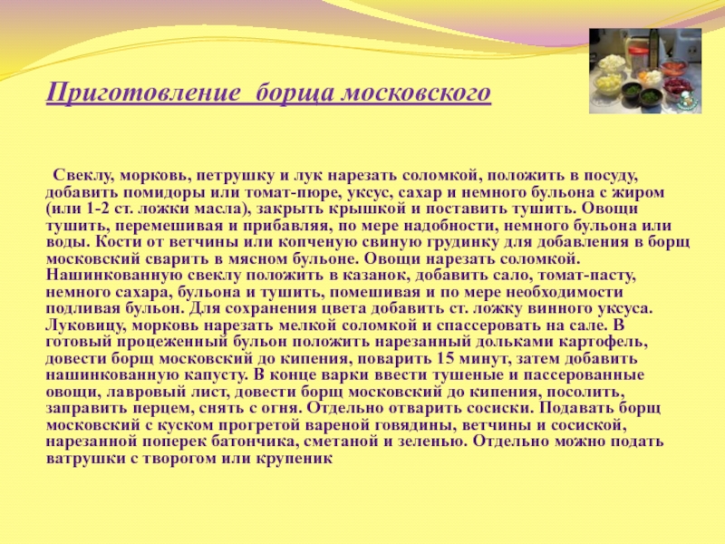 соломкой , доводят до кипения , кладут картофель, нарезанный брусочками или дольками, варят 10-15 мин, закладывают пассированные овощи и тушеную свеклу. Доводят до кипения . кладут сладкий перец, нарезанный соломкой , вводят пассированную муку, разведенную бульоном или водой, добавляют специи . соль . сахар и варят до готовности, перед подачей заправляют чесноком , растертым со шпигом. При отпуске кладут в тарелку мясо, наливают борщ, кладут сметану , зелень. Отдельно можно подать пампушки.