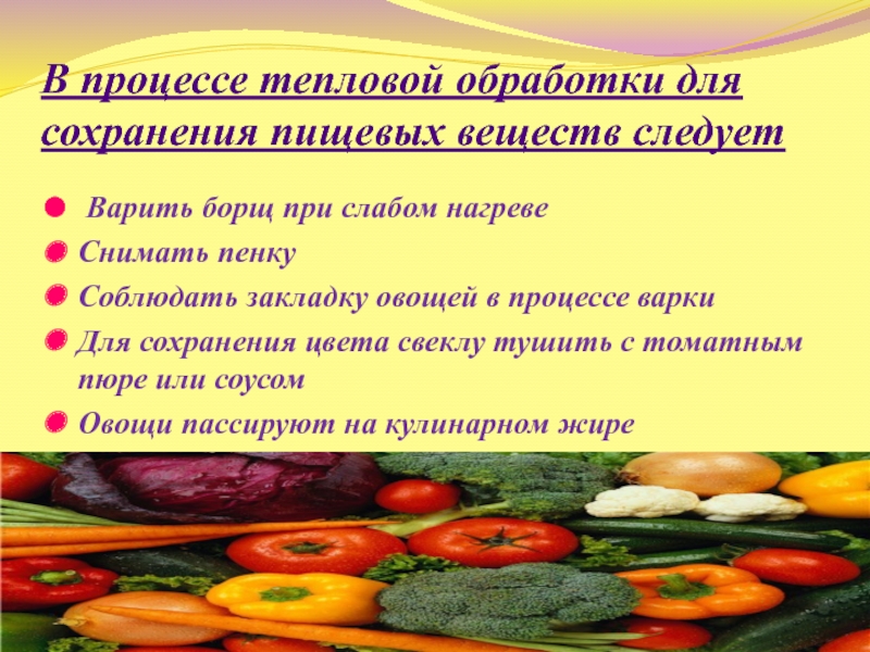 Слайд 11В процессе тепловой обработки для сохранения пищевых веществ следует