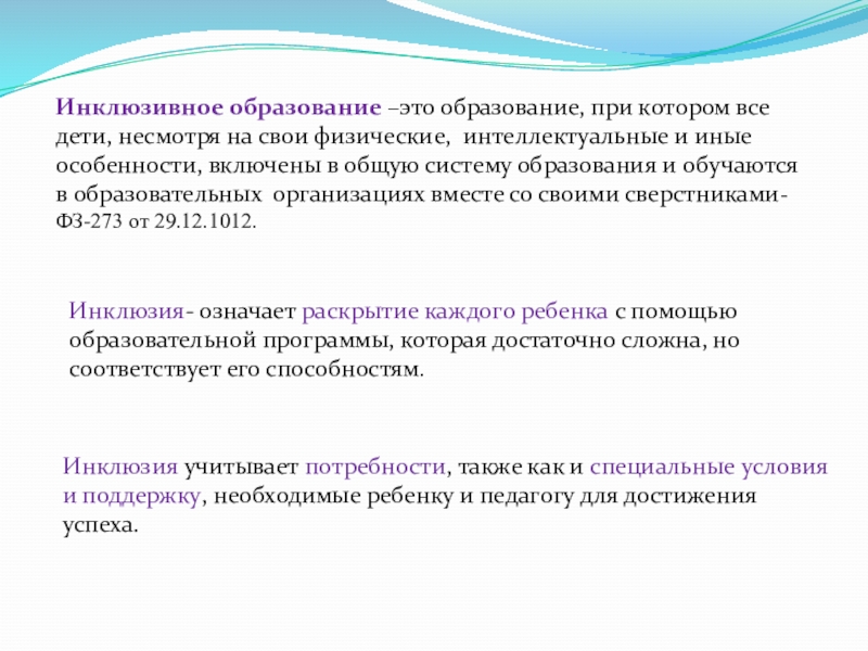 Инклюзия- означает раскрытие каждого ребенка с помощью образовательной программы, которая достаточно сложна, но соответствует его способностям.