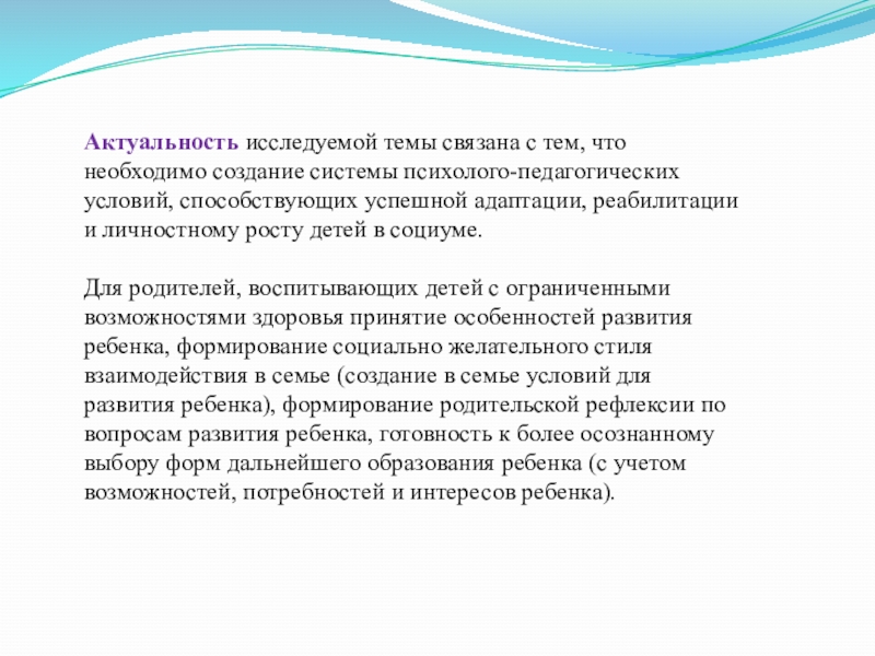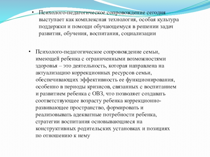 Психолого-педагогическое сопровождение семьи, имеющей ребенка с ограниченными возможностями здоровья – это деятельность, которая направлена на актуализацию коррекционных ресурсов семьи, обеспечивающих эффективность ее функционирования, особенно в периоды кризисов, связанных с воспитанием и развитием ребенка с ОВЗ, что позволяет создавать соответствующее возрасту ребенка коррекционно-развивающее пространство, формировать и реализовывать адекватные потребности ребенка, стратегии воспитания основывающиеся на конструктивных родительских установках и позициях по отношению к нему