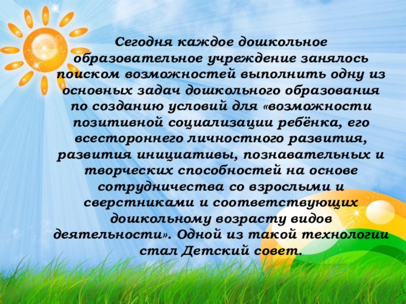 основных задач дошкольного образования по созданию условий для «возможности позитивной социализации ребёнка, его всестороннего личностного развития, развития инициативы, познавательных и творческих способностей на основе сотрудничества со взрослыми и сверстниками и соответствующих дошкольному возрасту видов деятельности». Одной из такой технологии стал Детский совет.