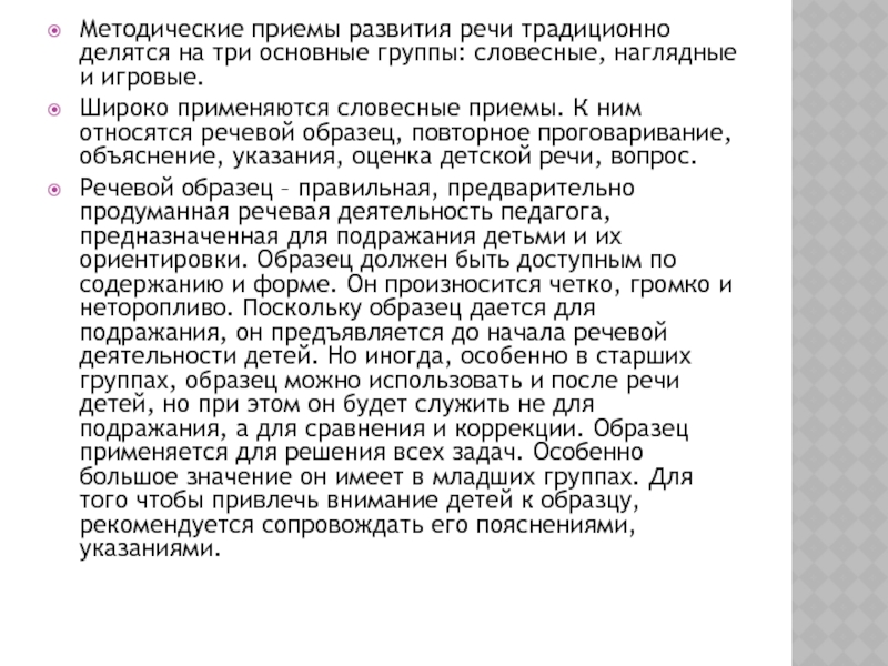 Широко применяются словесные приемы. К ним относятся речевой образец, повторное проговаривание, объяснение, указания, оценка детской речи, вопрос.