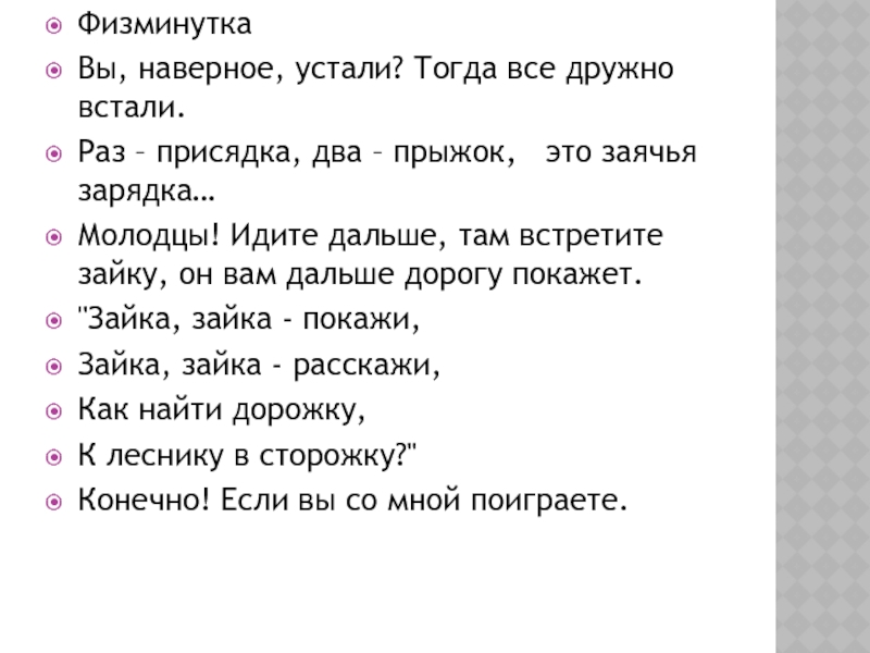 Молодцы! Идите дальше, там встретите зайку, он вам дальше дорогу покажет.