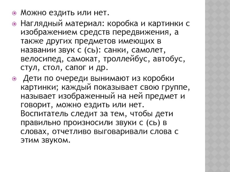Дети по очереди вынимают из коробки картинки; каждый показывает свою группе, называет изображенный на ней предмет и говорит, можно ездить или нет. Воспитатель следит за тем, чтобы дети правильно произносили звуки с (сь) в словах, отчетливо выговаривали слова с этим звуком.