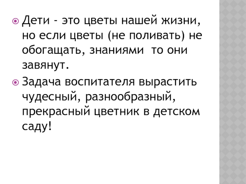 Задача воспитателя вырастить чудесный, разнообразный, прекрасный цветник в детском саду!