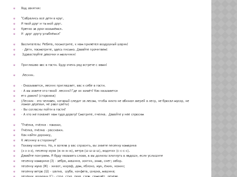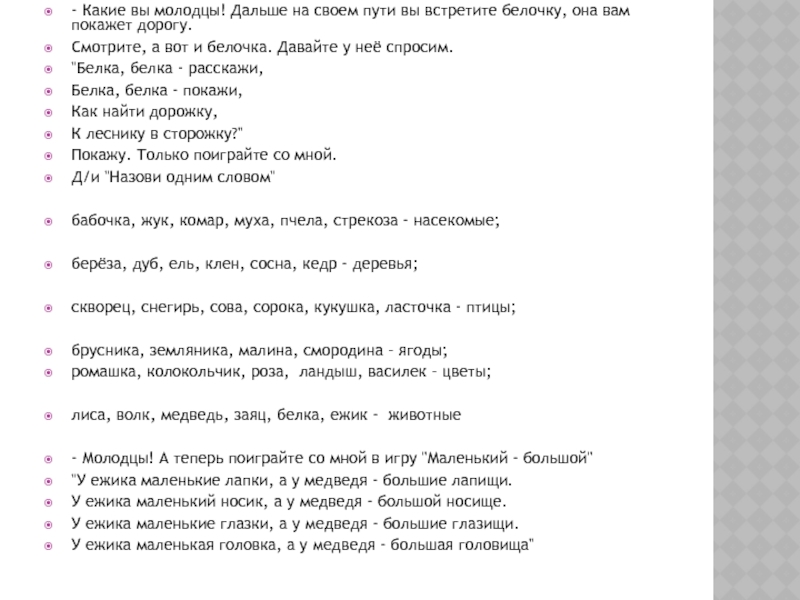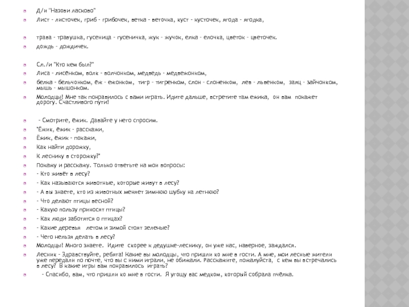 Лесник - Здравствуйте, ребята! Какие вы молодцы, что пришли ко мне в гости. А мне, мои лесные жители уже передали по почте, что вы с ними играли, не обижали. Расскажите, пожалуйста, с кем вы встречались в лесу? В какие игры вам понравилось играть?