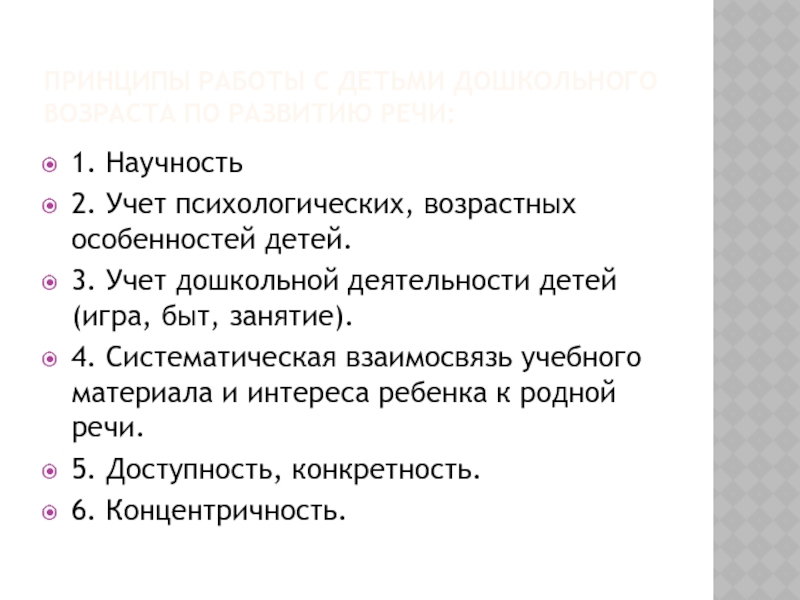Слайд 6Принципы работы с детьми дошкольного возраста по развитию речи:
