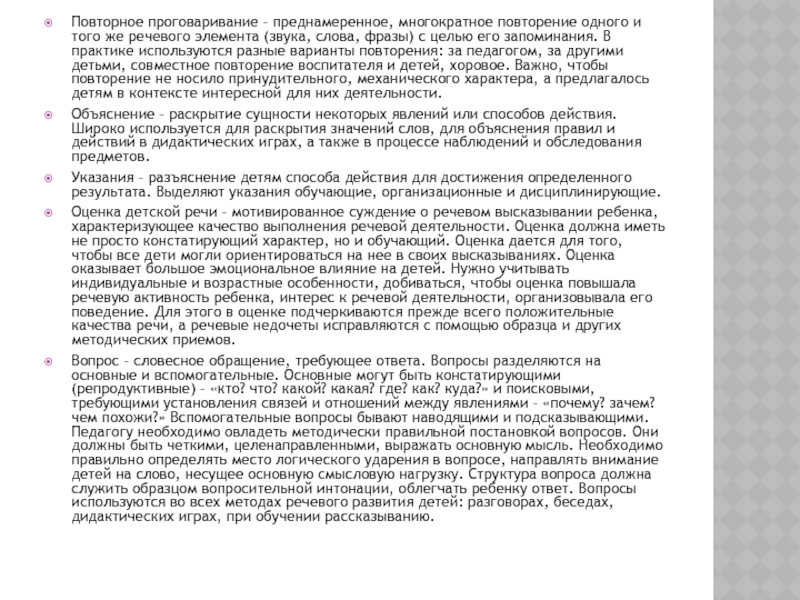 элемента (звука, слова, фразы) с целью его запоминания. В практике используются разные варианты повторения: за педагогом, за другими детьми, совместное повторение воспитателя и детей, хоровое. Важно, чтобы повторение не носило принудительного, механического характера, а предлагалось детям в контексте интересной для них деятельности.