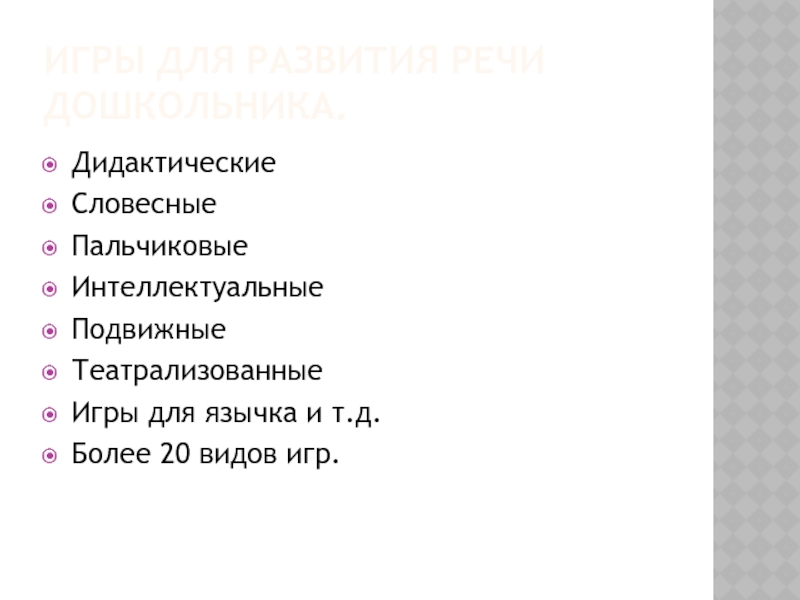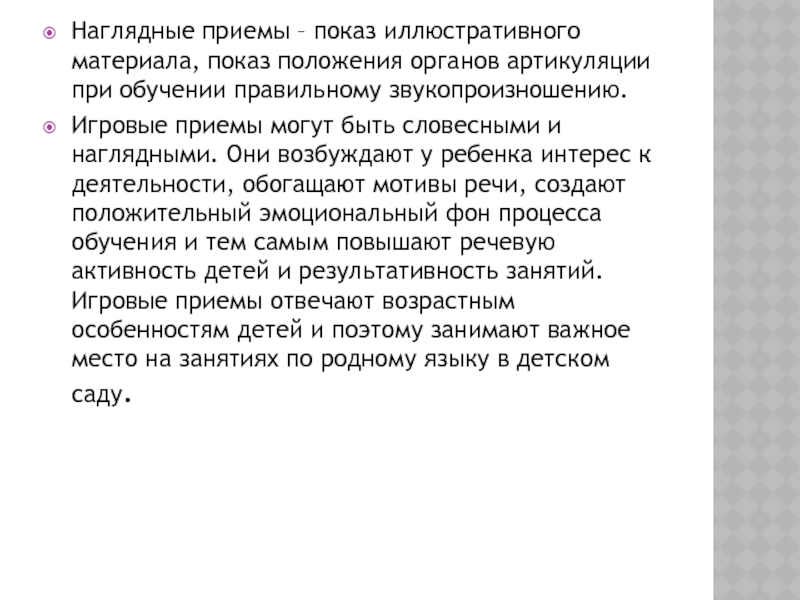 Игровые приемы могут быть словесными и наглядными. Они возбуждают у ребенка интерес к деятельности, обогащают мотивы речи, создают положительный эмоциональный фон процесса обучения и тем самым повышают речевую активность детей и результативность занятий. Игровые приемы отвечают возрастным особенностям детей и поэтому занимают важное место на занятиях по родному языку в детском саду.