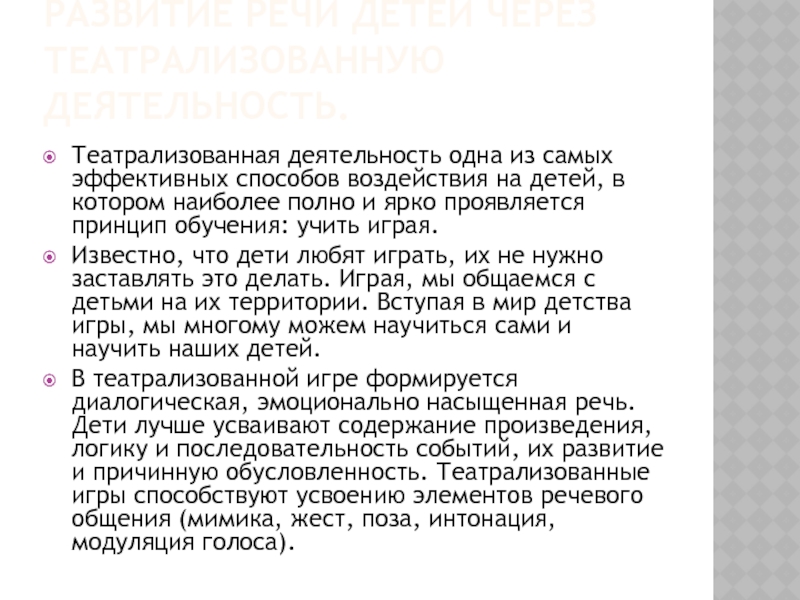 В театрализованной игре формируется диалогическая, эмоционально насыщенная речь. Дети лучше усваивают содержание произведения, логику и последовательность событий, их развитие и причинную обусловленность. Театрализованные игры способствуют усвоению элементов речевого общения (мимика, жест, поза, интонация, модуляция голоса).