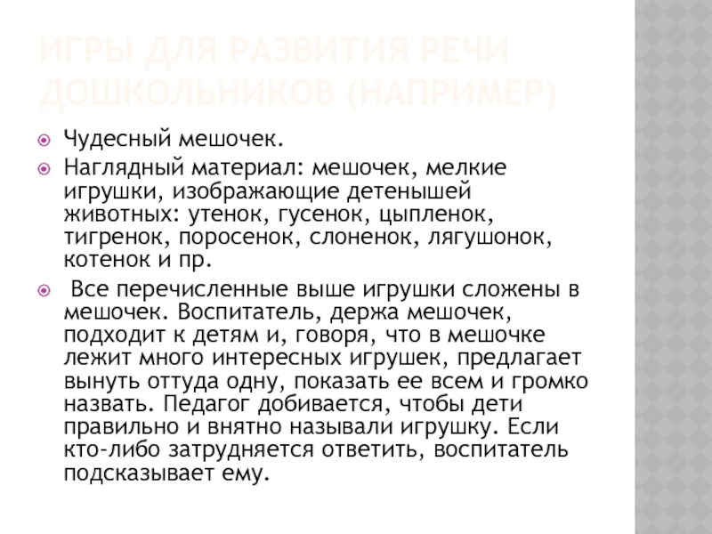 Все перечисленные выше игрушки сложены в мешочек. Воспитатель, держа мешочек, подходит к детям и, говоря, что в мешочке лежит много интересных игрушек, предлагает вынуть оттуда одну, показать ее всем и громко назвать. Педагог добивается, чтобы дети правильно и внятно называли игрушку. Если кто-либо затрудняется ответить, воспитатель подсказывает ему.