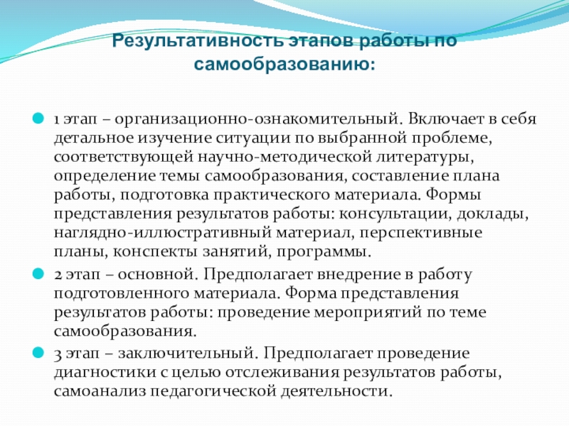 Результативность этапов работы по самообразованию:  1 этап – организационно-ознакомительный. Включает в себя детальное изучение ситуации по