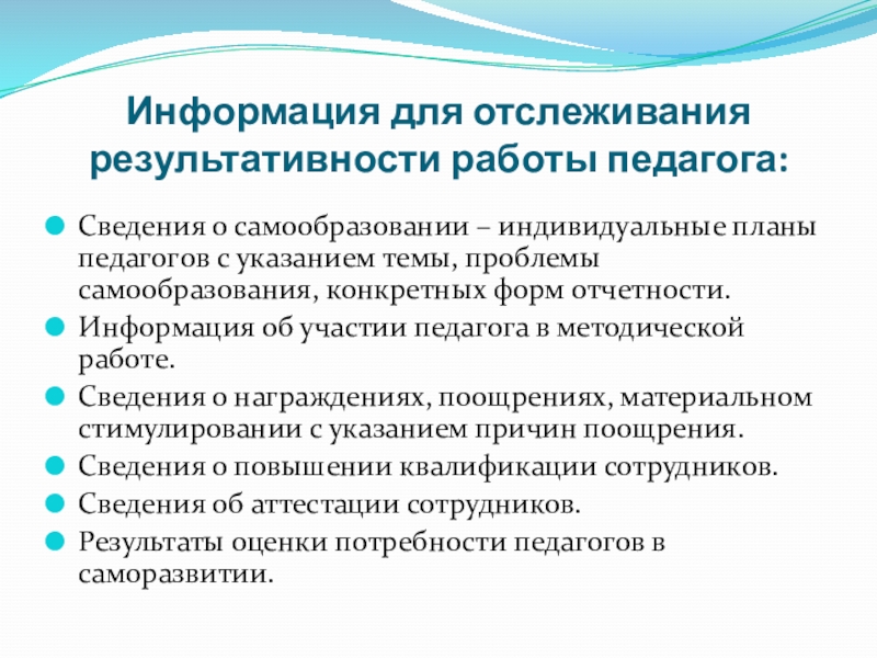 Слайд 11 Информация для отслеживания результативности работы педагога: