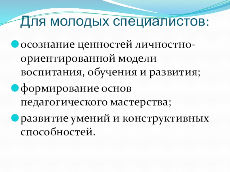 Для молодых специалистов: осознание ценностей личностно-ориентированной модели воспитания, обучения и развития;формирование основ педагогического мастерства;развитие