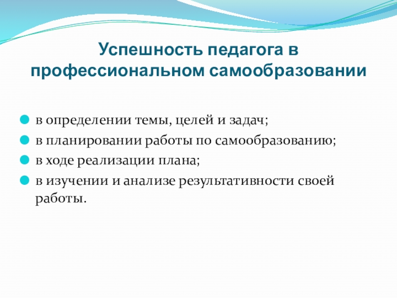 Успешность педагога в профессиональном самообразовании в определении темы, целей и задач;в планировании работы по самообразованию;в ходе реализации