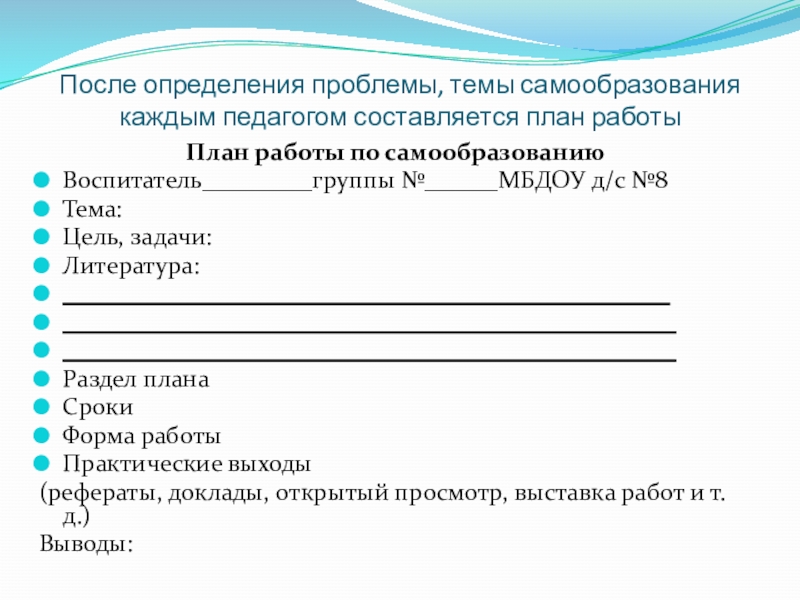 После определения проблемы, темы самообразования каждым педагогом составляется план работыПлан работы по самообразованиюВоспитатель_________группы №______МБДОУ д/с №8Тема:Цель, задачи:Литература:_________________________________________