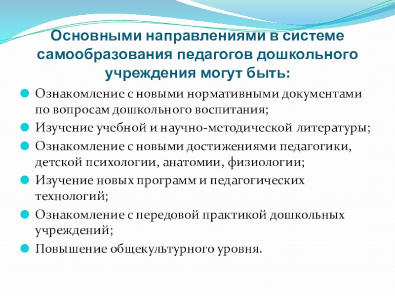 Основными направлениями в системе самообразования педагогов дошкольного учреждения могут быть: Ознакомление с новыми нормативными документами по вопросам дошкольного воспитания;Изучение учебной и научно-методической литературы;Ознакомление с новыми достижениями педагогики, детской психологии,