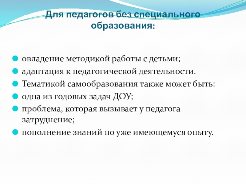 Для педагогов без специального образования: овладение методикой работы с детьми;адаптация