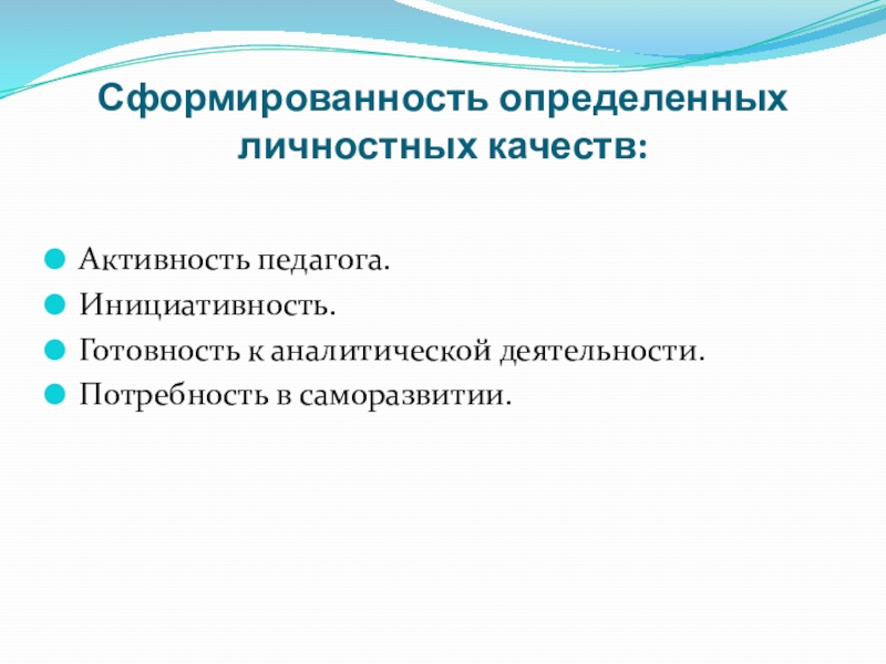 Сформированность определенных  личностных качеств: Активность педагога. Инициативность. Готовность к аналитической деятельности. Потребность в саморазвитии.