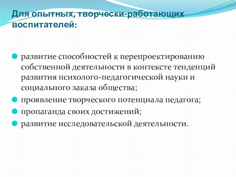 Для опытных, творчески-работающих воспитателей: развитие способностей к перепроектированию собственной деятельности в контексте тенденций развития психолого-педагогической науки и