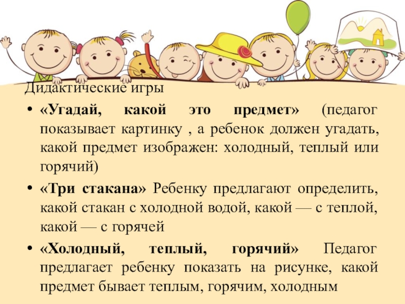 должен угадать, какой предмет изображен: холодный, теплый или горячий)