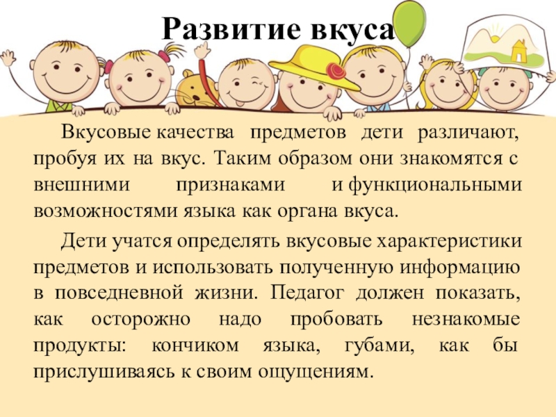 Вкусовые качества предметов дети различают, пробуя их на вкус. Таким образом