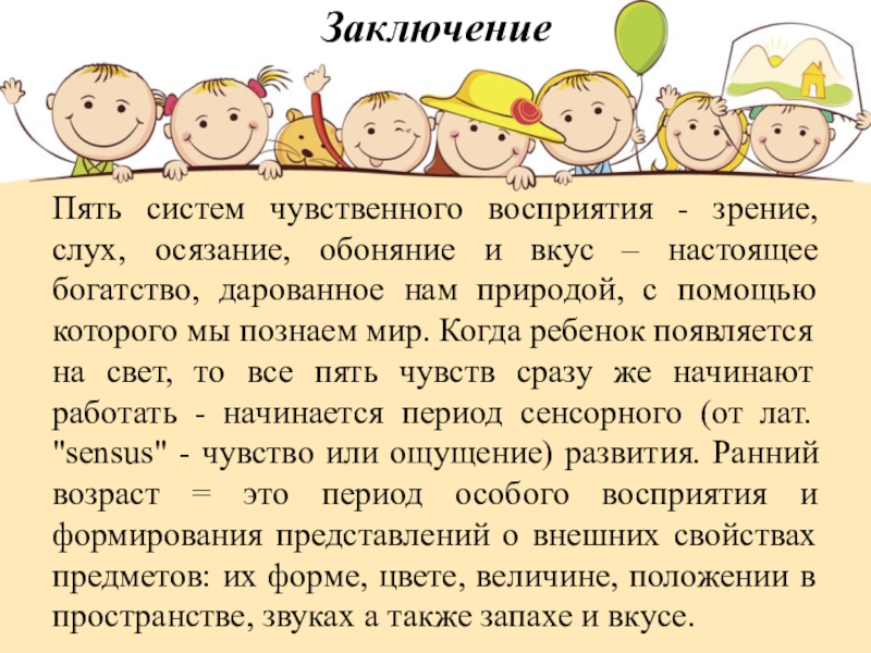 – настоящее богатство, дарованное нам природой, с помощью которого мы познаем мир. Когда ребенок появляется на свет, то все пять чувств сразу же начинают работать - начинается период сенсорного (от лат. "sensus" - чувство или ощущение) развития. Ранний возраст = это период особого восприятия и формирования представлений о внешних свойствах предметов: их форме, цвете, величине, положении в пространстве, звуках а также запахе и вкусе.