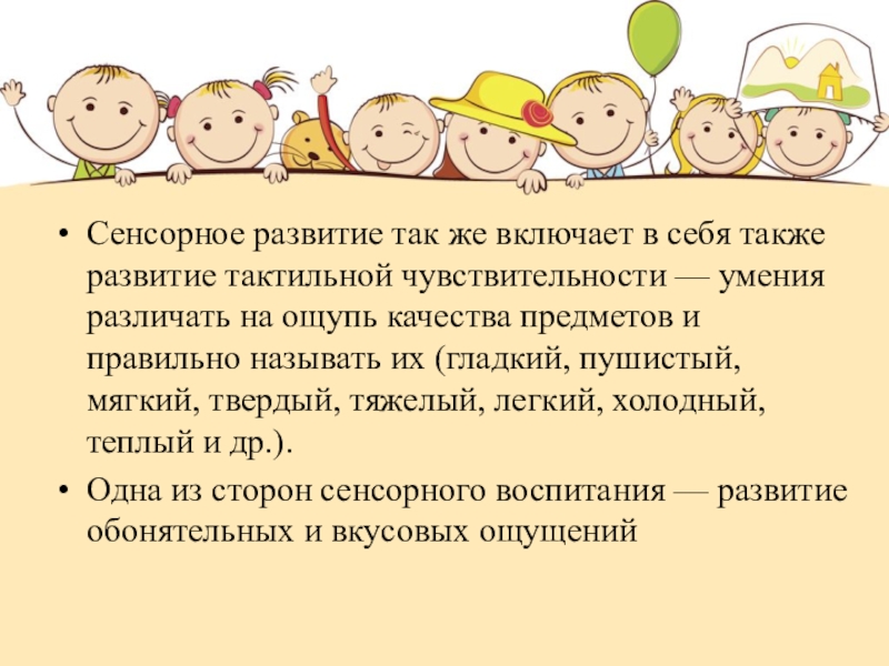 Слайд 6Сенсорное развитие так же включает в себя также развитие тактильной чувствительности