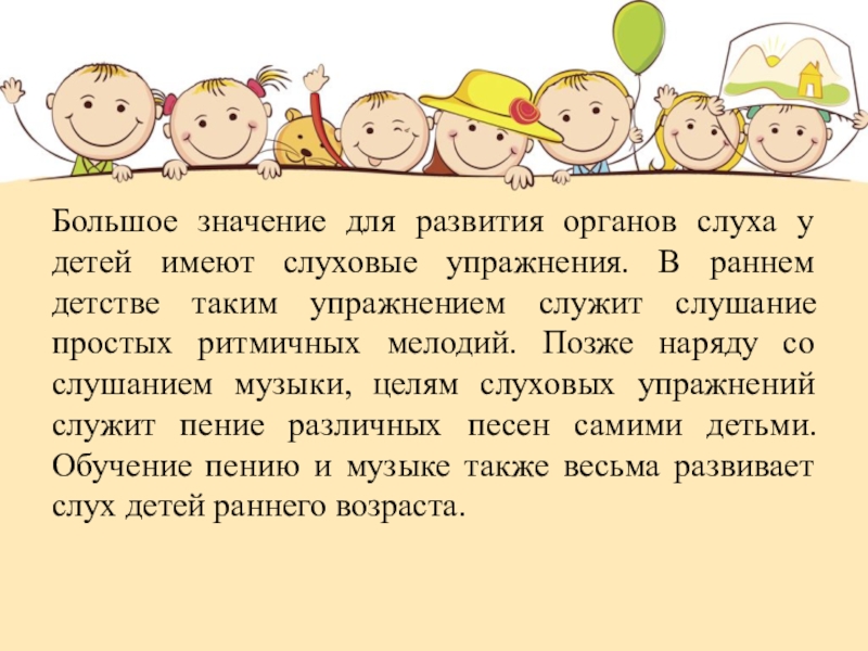Слайд 22Большое значение для развития органов слуха у детей имеют слуховые упражнения.