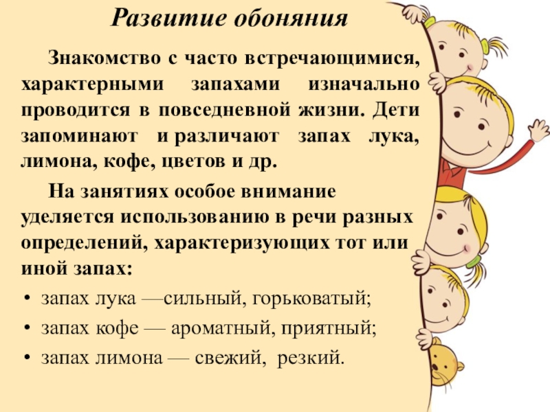 Дети запоминают и различают запах лука, лимона, кофе, цветов и др.