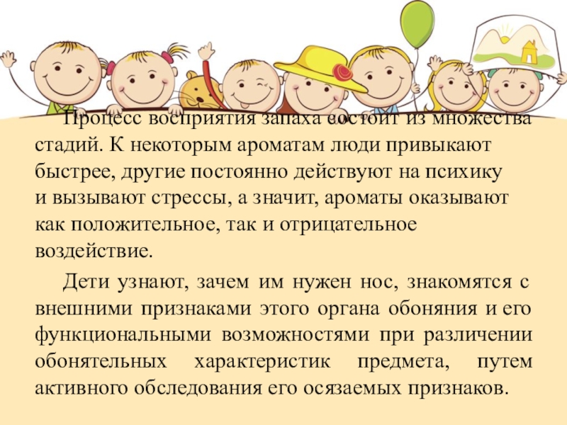 Дети узнают, зачем им нужен нос, знакомятся с внешними признаками этого органа обоняния и его функциональными возможностями при различении обонятельных характеристик предмета, путем активного обследования его осязаемых признаков.