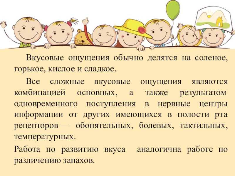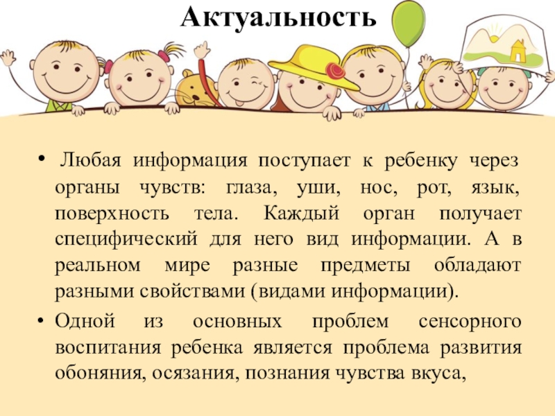 Одной из основных проблем сенсорного воспитания ребенка является проблема развития обоняния, осязания, познания чувства вкуса,
