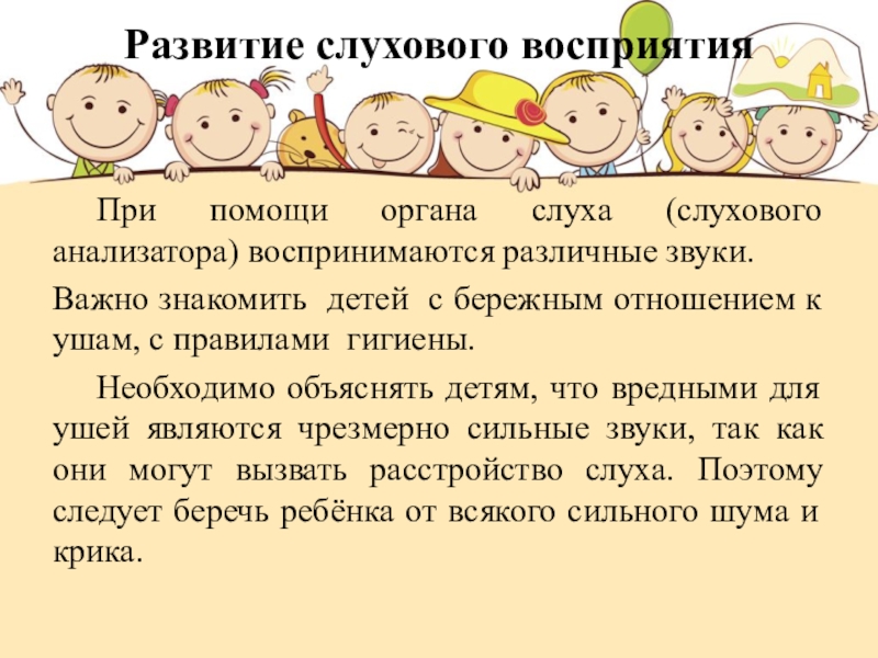 Необходимо объяснять детям, что вредными для ушей являются чрезмерно сильные звуки, так как они могут вызвать расстройство слуха. Поэтому следует беречь ребёнка от всякого сильного шума и крика.