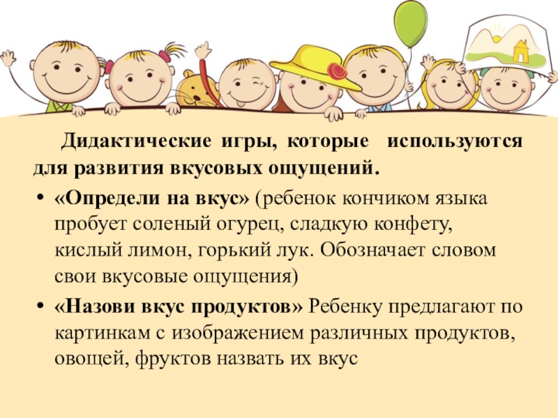 Слайд 12 Дидактические игры, которые используются для развития вкусовых ощущений.