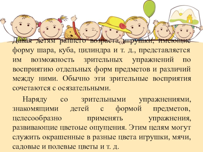 Слайд 20Давая детям раннего возраста игрушки, имеющие форму шара, куба, цилиндра и