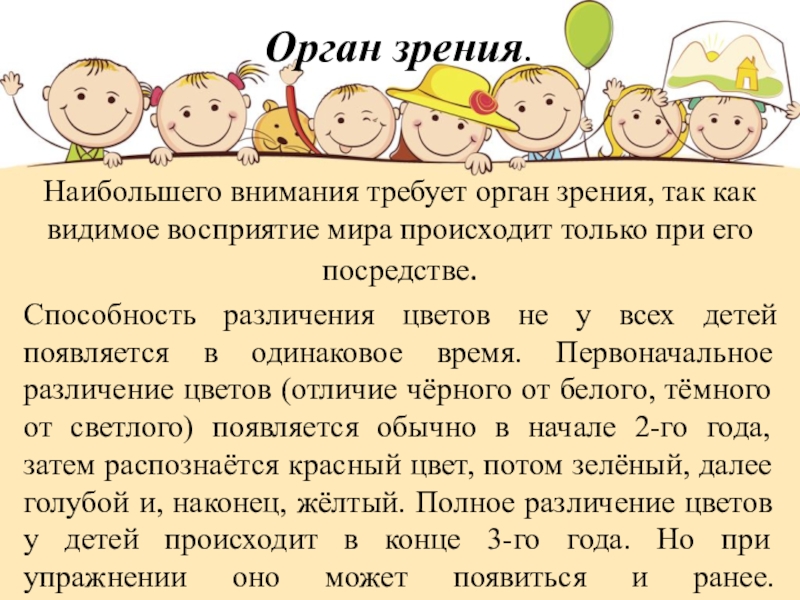 Способность различения цветов не у всех детей появляется в одинаковое время. Первоначальное различение цветов (отличие чёрного от белого, тёмного от светлого) появляется обычно в начале 2-го года, затем распознаётся красный цвет, потом зелёный, далее голубой и, наконец, жёлтый. Полное различение цветов у детей происходит в конце 3-го года. Но при упражнении оно может появиться и ранее.