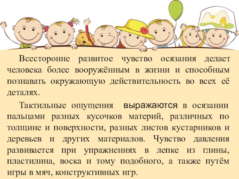 Слайд 14 Всесторонне развитое чувство осязания делает человека более вооружённым в жизни и