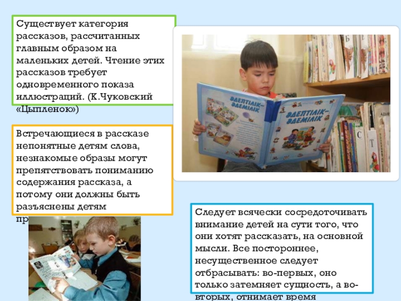 Встречающиеся в рассказе непонятные детям слова, незнакомые образы могут препятствовать пониманию содержания рассказа, а потому они должны быть разъяснены детям предварительно