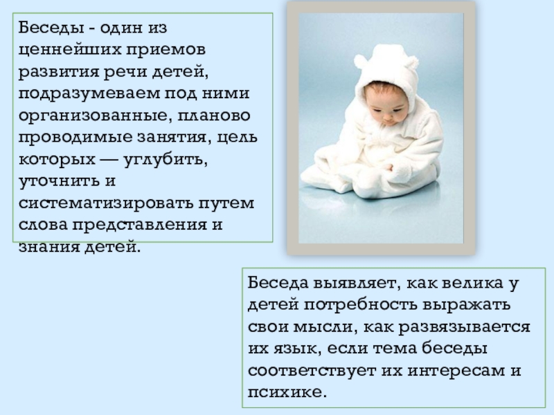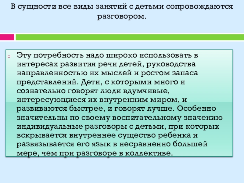 В сущности все виды занятий с детьми сопровождаются разговором.