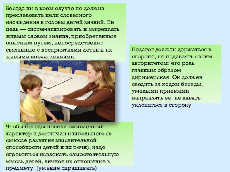 Чтобы беседы носили оживленный характер и достигали наибольшего (в смысле развития мыслительной способности детей и их речи), надо стремиться извлекать самостоятельную мысль детей, личное их отношение к предмету. (умение спрашивать)