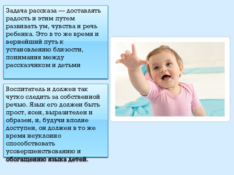Воспитатель и должен так чутко следить за собственной речью. Язык его должен быть прост, ясен, выразителен и образен, и, будучи вполне доступен, он должен в то же время неуклонно способствовать усовершенствованию и обогащению языка детей.