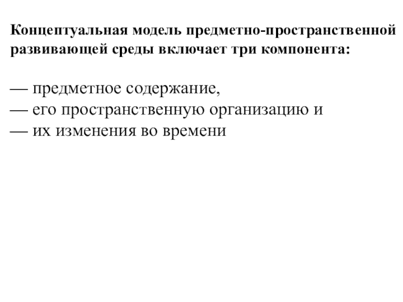 Слайд 18Концептуальная модель предметно-пространственной развивающей среды включает три компонента: