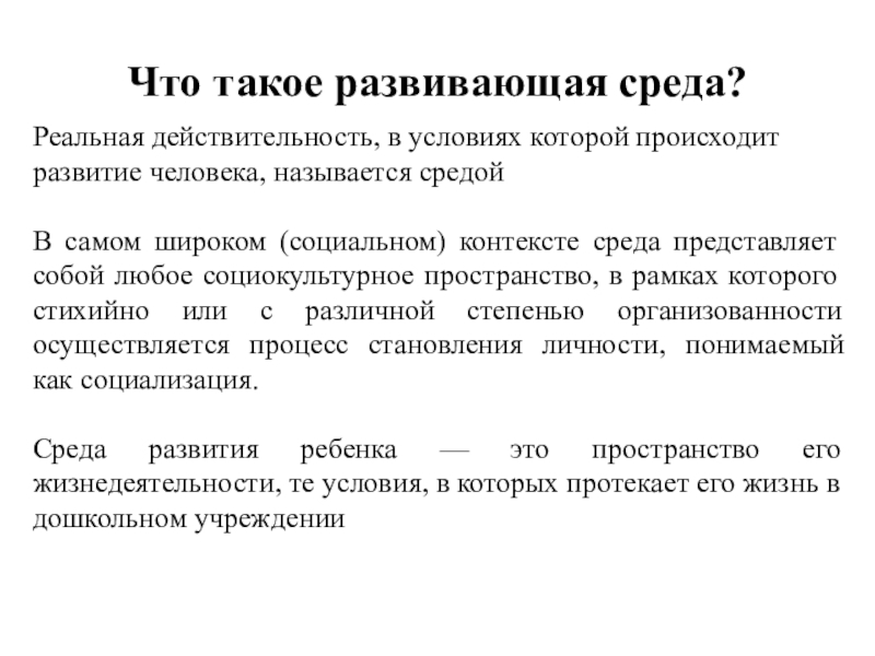 Среда развития ребенка — это пространство его жизнедеятельности, те условия, в которых протекает его жизнь в дошкольном учреждении