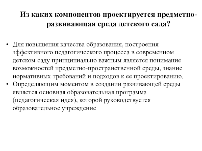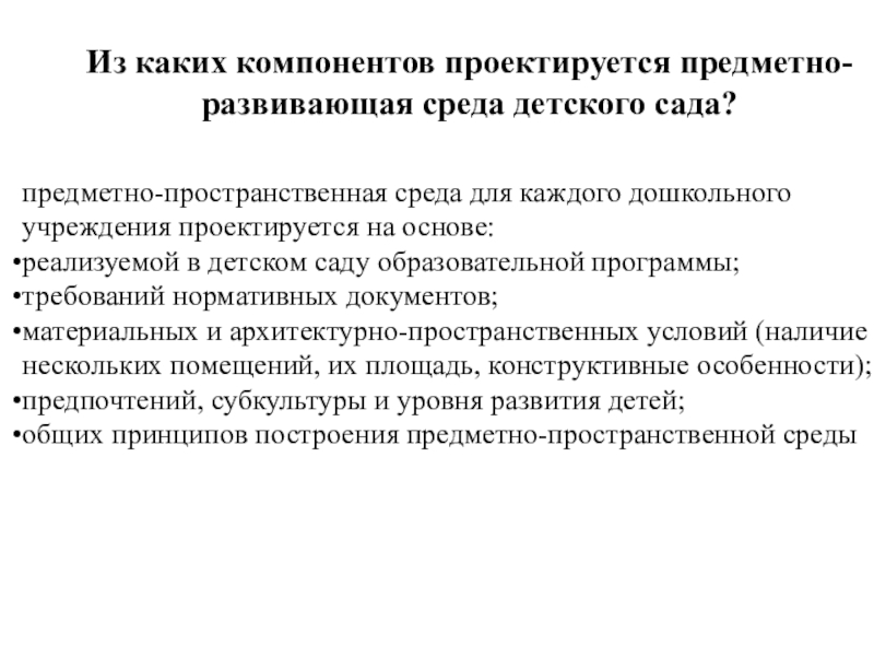 Слайд 16Из каких компонентов проектируется предметно-развивающая среда детского сада?