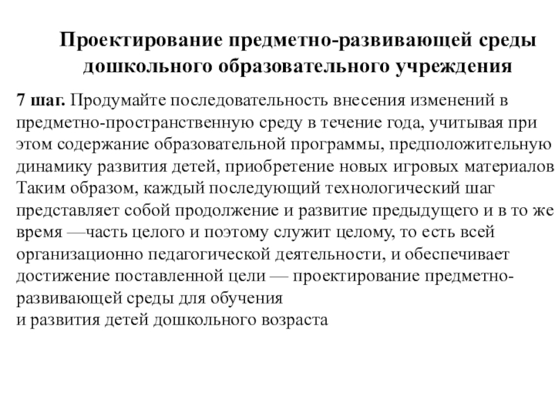 в предметно-пространственную среду в течение года, учитывая при этом содержание образовательной программы, предположительную динамику развития детей, приобретение новых игровых материалов. Таким образом, каждый последующий технологический шаг представляет собой продолжение и развитие предыдущего и в то же время —часть целого и поэтому служит целому, то есть всей организационно педагогической деятельности, и обеспечивает достижение поставленной цели — проектирование предметно-развивающей среды для обучения