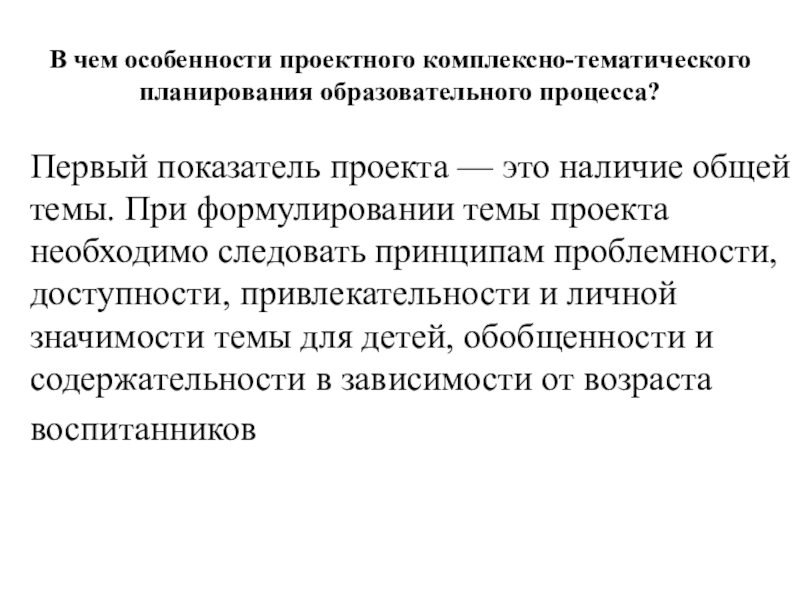 это наличие общей темы. При формулировании темы проекта необходимо следовать принципам проблемности, доступности, привлекательности и личной значимости темы для детей, обобщенности и содержательности в зависимости от возраста