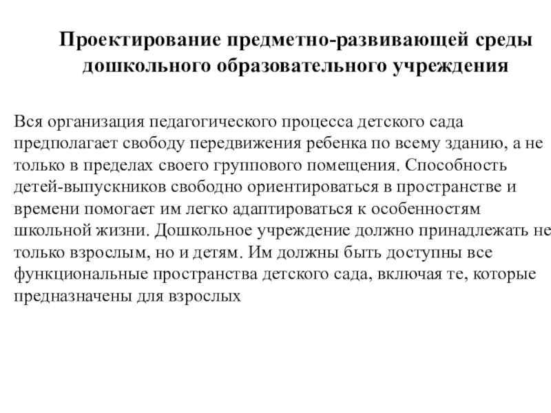 предполагает свободу передвижения ребенка по всему зданию, а не только в пределах своего группового помещения. Способность детей-выпускников свободно ориентироваться в пространстве и времени помогает им легко адаптироваться к особенностям школьной жизни. Дошкольное учреждение должно принадлежать не только взрослым, но и детям. Им должны быть доступны все функциональные пространства детского сада, включая те, которые предназначены для взрослых