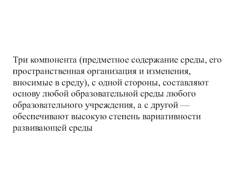 Слайд 27Три компонента (предметное содержание среды, его пространственная организация и изменения, вносимые