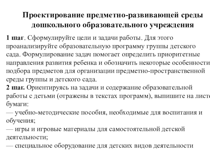 работы. Для этого проанализируйте образовательную программу группы детского сада. Формулирование задач помогает определить приоритетные направления развития ребенка и обозначить некоторые особенности подбора предметов для организации предметно-пространственной среды группы и детского сада.